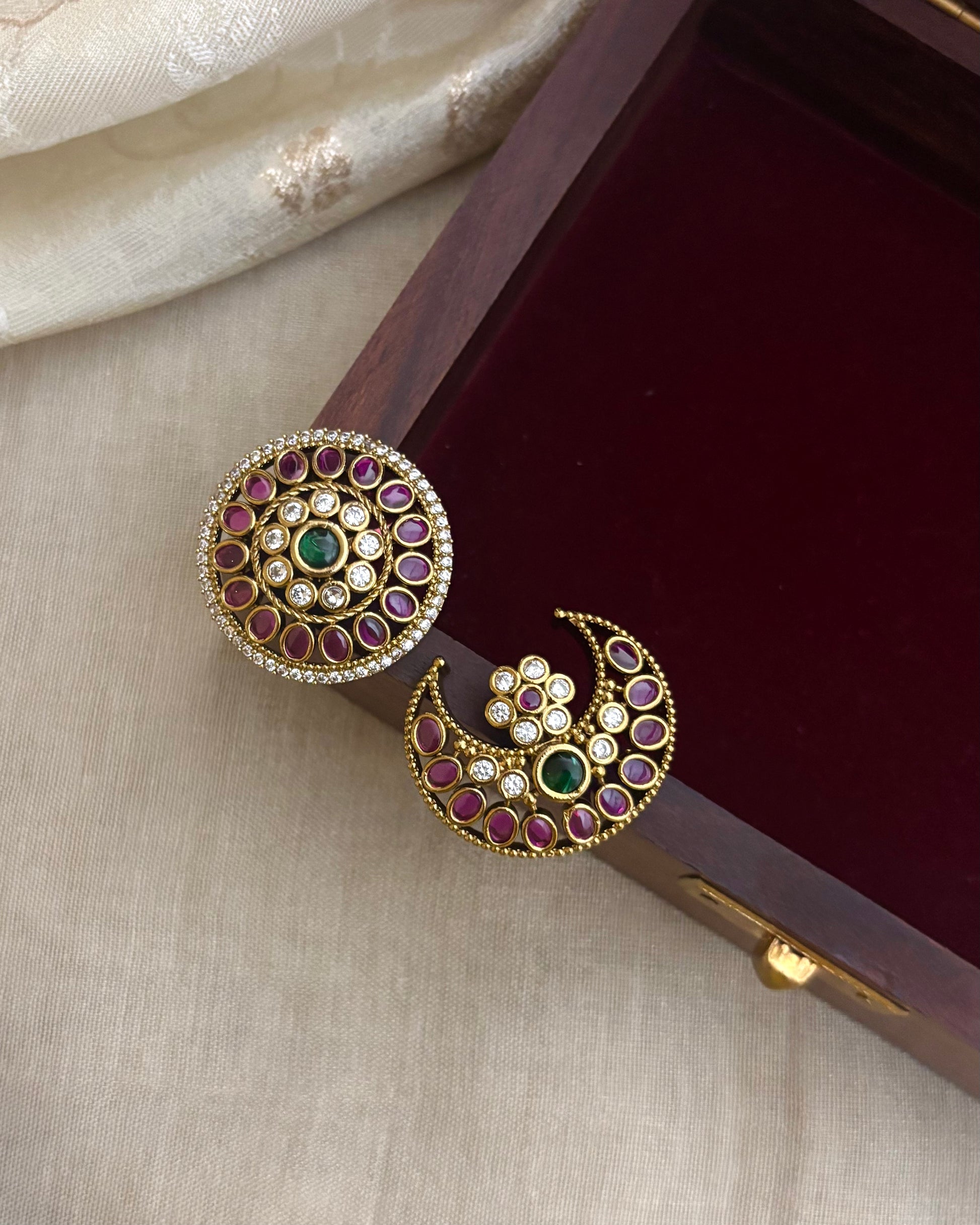 Inspired by celestial beauty and rooted in South Indian tradition, this Sun & Moon Kemp Hair Accessory set is a timeless symbol of cultural elegance. Adorned with classic kemp stones in rich ruby, white and green hues, each piece is meticulously crafted for a radiant finish.
