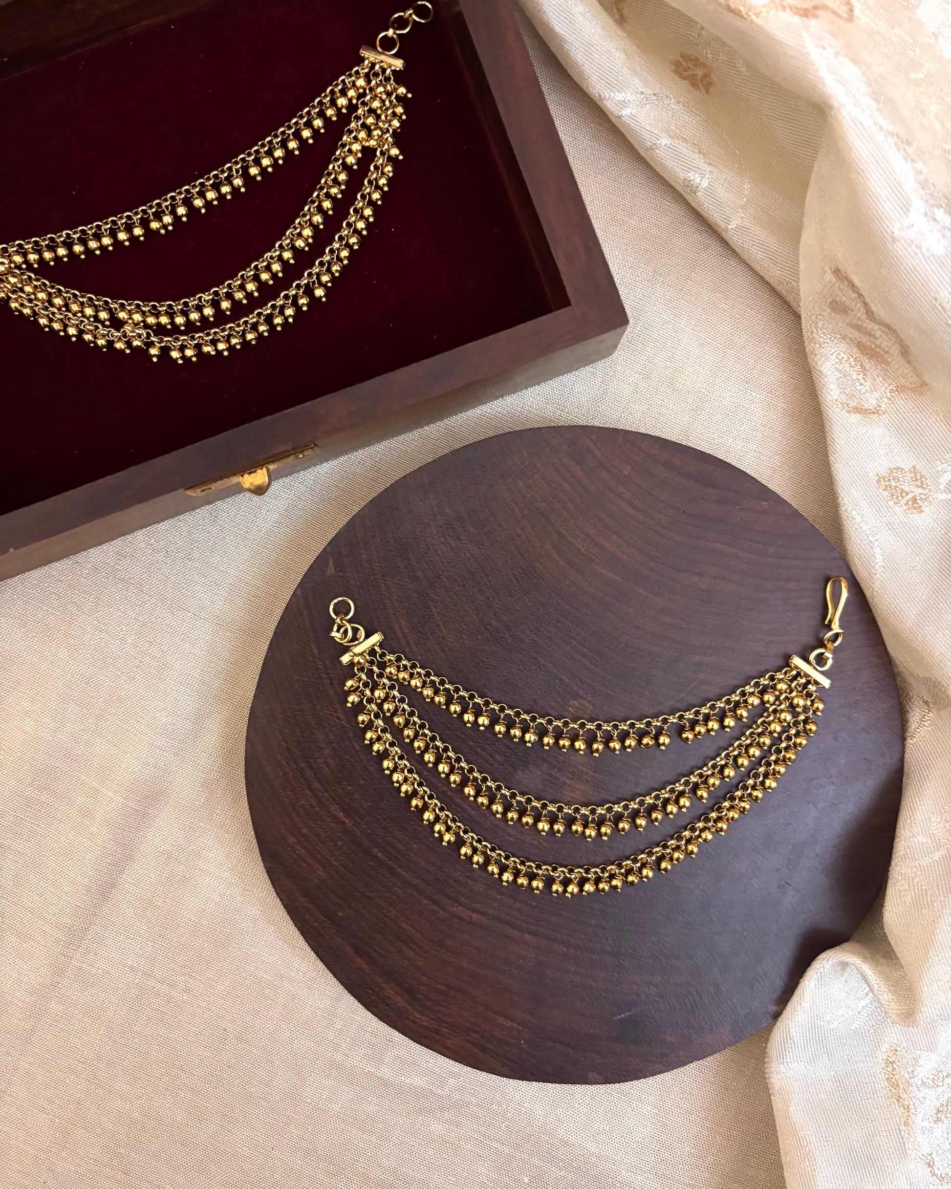 Add a touch of understated elegance to your bridal look with this three-layer minimal antique ear chain, designed for effortless pairing with jhumkas, chandbalis, or studs. Featuring a fine antique gold polish and delicate craftsmanship, this ear chain enhances your earrings without overpowering them, making it ideal for brides who prefer a refined, graceful style.