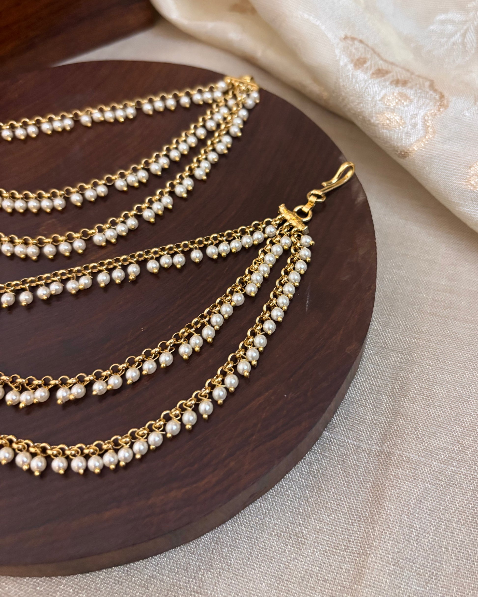 Elevate your bridal look with this three-layer pearl ear chain, crafted to perfection for traditional South Indian weddings and festive occasions. The layers of lustrous pearls add graceful volume while maintaining a lightweight, comfortable feel throughout long hours of wear. Designed to pair beautifully with jhumkas, chandbalis, and studs, this ear chain enhances your earrings while framing your face with soft, classic charm.