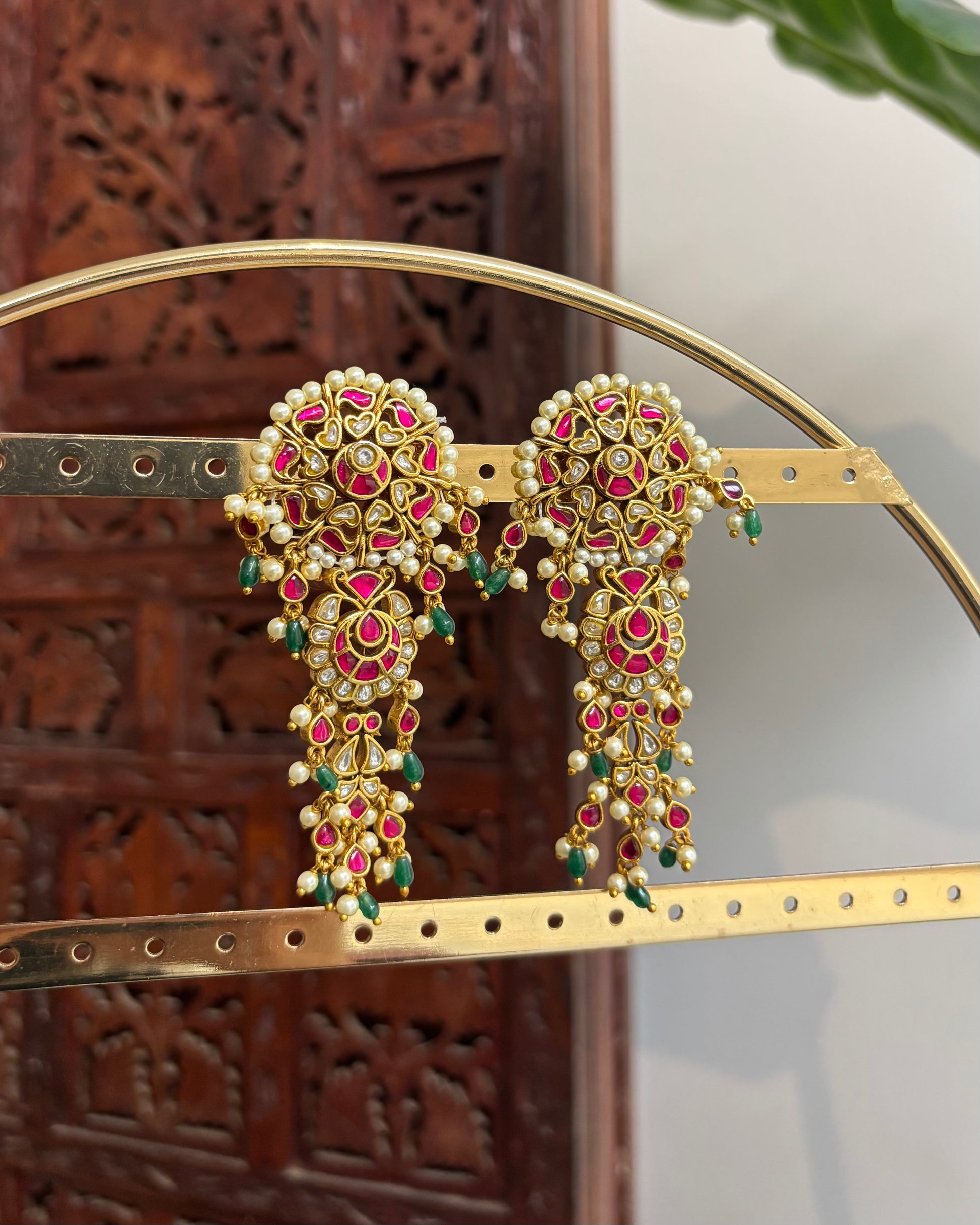 Delicate pearl detailing adds softness and movement, beautifully complementing the vibrant stones and enhancing the overall grandeur of the earrings. Their elongated silhouette frames the face gracefully, making them perfect for weddings, festive occasions, and statement traditional looks.